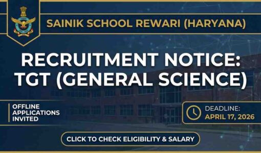 കേന്ദ്ര പ്രതിരോധ മന്ത്രാലയത്തിന് കീഴിലുള്ള സൈനിക് സ്കൂൾ സൊസൈറ്റിയുടെ (Sainik Schools Society) നിയന്ത്രണത്തിൽ ഹരിയാനയിൽ പ്രവർത്തിക്കുന്ന സൈനിക് സ്കൂൾ റെവാരിയിൽ (Sainik School Rewari) പുതിയ തൊഴിലവസരം. ട്രെയിൻഡ് ഗ്രാജ്വേറ്റ്…