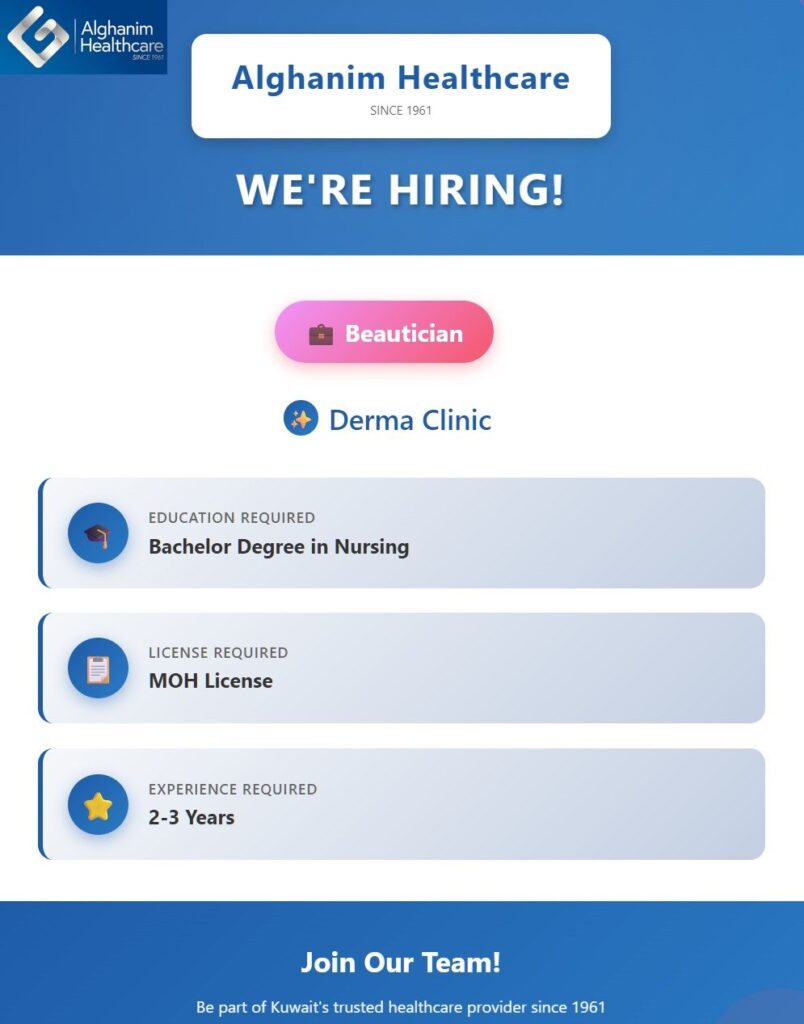 Alghanim Healthcare is actively recruiting for several positions for a derma clinic located in Al Kuwait, Kuwait. The available roles are Registered Nurse, Beautician, and Receptionist.