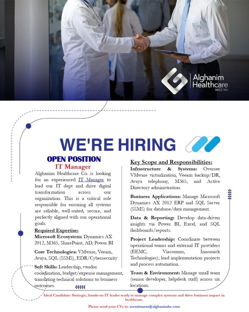 | Receptionist | Experience in a clinic setting is a plus | recruitment@alghanimhc.com |
