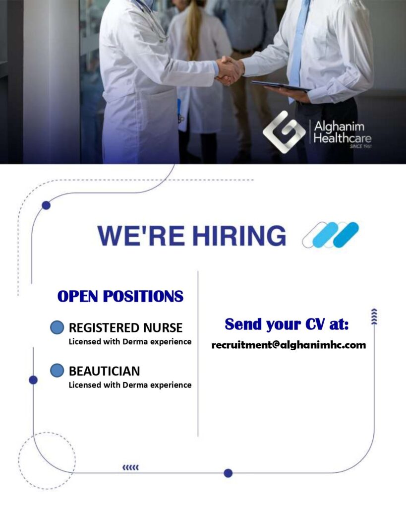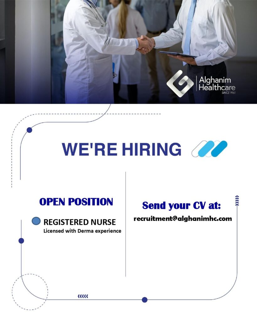 | Registered Nurse | Experience in dermatology is a plus | recruitment@alghanimhc.com |