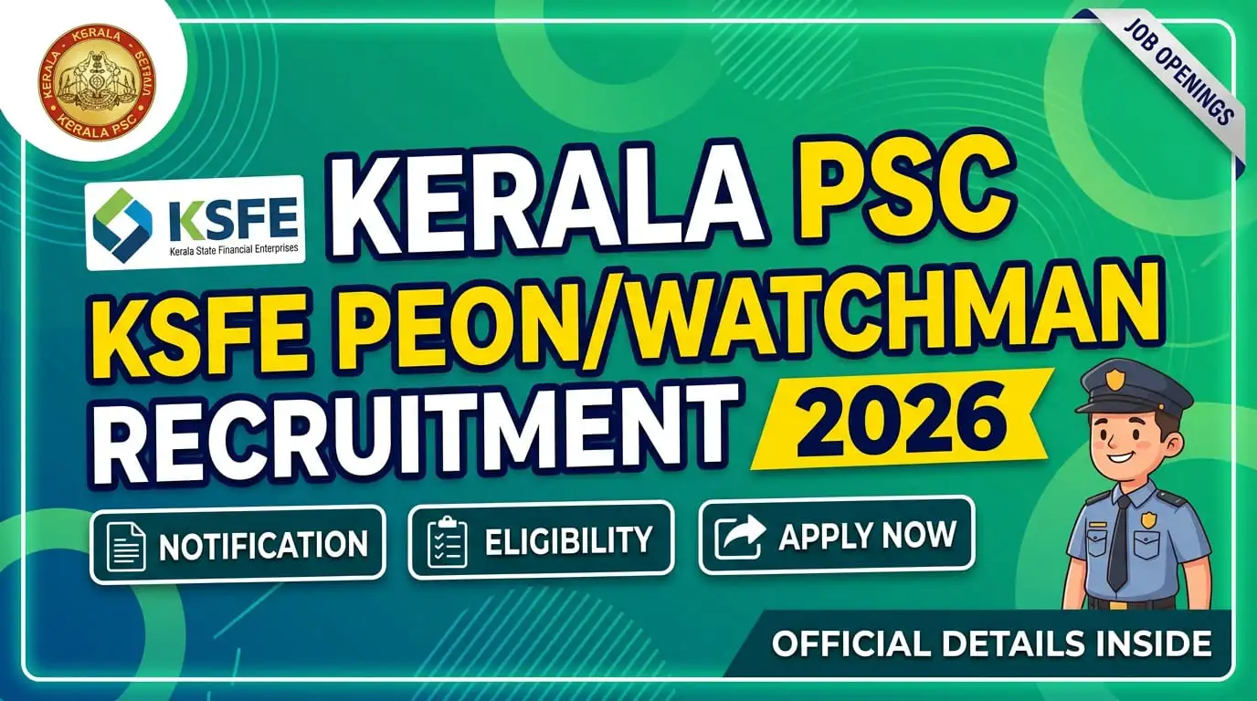 കേരള സ്റ്റേറ്റ് ഫിനാൻഷ്യൽ എൻ്റർപ്രൈസസ് ലിമിറ്റഡിൽ (KSFE Limited) പ്യൂൺ/വാച്ച്മാൻ (Peon/Watchman) തസ്തികയിലേക്ക് കേരള പബ്ലിക് സർവ്വീസ് കമ്മീഷൻ പുതിയ വിജ്ഞാപനം പുറത്തിറക്കി. കാറ്റഗറി നമ്പർ 05/2026 മുതൽ 12/2026 വരെയുള്ള ഈ രണ്ടാം എൻ.സി.എ (Second NCA) വിജ്ഞാപനപ്രകാരം നിർദ്ദിഷ്ട സംവരണ സമുദായങ്ങൾക്ക് മാത്രമാണ് അപേക്ഷിക്കാൻ അവസരമുള്ളത്. യോഗ്യരായ ഉദ്യോഗാർത്ഥികൾക്ക് 2026 ഏപ്രിൽ 1 വരെ പി.എസ്.സി തുളസി പ്രൊഫൈൽ വഴി അപേക്ഷ സമർപ്പിക്കാം.