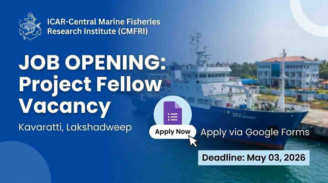 ലക്ഷദ്വീപ് സി.എം.എഫ്.ആർ.ഐ ക്യാമ്പസിലേക്കുള്ള പ്രോജക്ട് ഫെലോ തസ്തികയിലേക്ക് ഗൂഗിൾ ഫോം വഴി അപേക്ഷിക്കാനുള്ള അവസാന തീയതി 2026 മെയ് 03 ആണ് (03.05.2026).