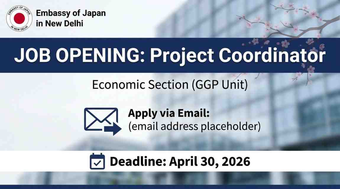 ജപ്പാൻ എംബസിയിലെ പ്രോജക്ട് കോർഡിനേറ്റർ തസ്തികയിലേക്ക് ഇമെയിൽ അല്ലെങ്കിൽ തപാൽ വഴി അപേക്ഷകൾ സമർപ്പിക്കാനുള്ള അവസാന തീയതി 2026 ഏപ്രിൽ 30 ആണ് (30th April 2026).