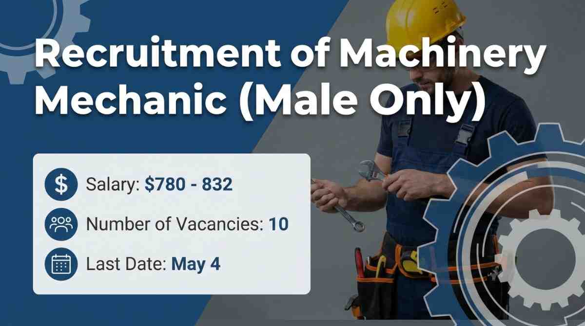 - Job Role: മെഷിനറി മെക്കാനിക് (Machinery Mechanic – Male Only).