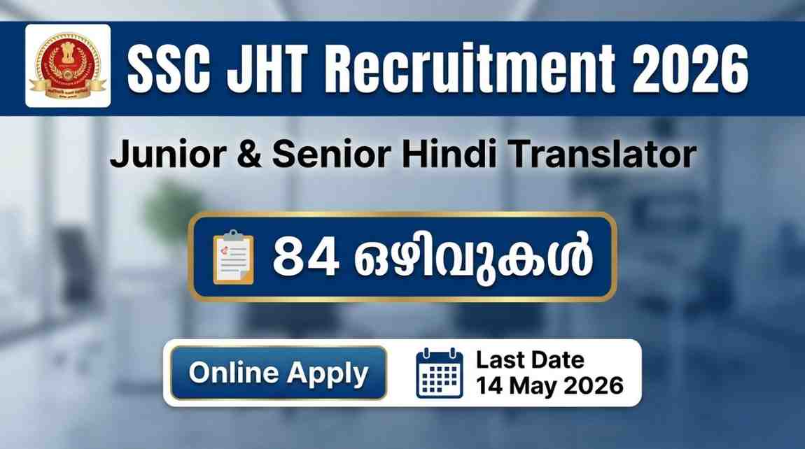 Staff Selection Commission (SSC) 2026-ൽ Combined Hindi Translators Examination (CHTE) 2026 വഴി Group ‘B’ Non-Gazetted തസ്തികകളിലേക്ക് നേരിട്ട് റിക്രൂട്ട്മെന്റ് നടത്തുകയാണ്. Junior Hindi Translator (JHT), Junior Translation Officer (JTO), Junior Translator (JT), Senior Hindi Translator (SHT), Senior Translation Officer (STO), Senior Translator (ST) എന്നീ തസ്തികകളിലായി ആകെ 84 ഒഴിവുകൾ (tentative) ഈ വർഷം പ്രഖ്യാപിക്കപ്പെട്ടിട്ടുണ്ട്. ഇന്ത്യ മുഴുവൻ ഉള്ള Central Government Ministries, Departments, Organizations-ൽ ആണ് നിയമനം. ശമ്പളം ₹35,400 മുതൽ ₹1,42,400 വരെ (Pay Level 6 & 7). Online Application 23 ഏപ്രിൽ 2026 മുതൽ തുറന്നിരിക്കുന്നു; അവസാന തീയതി 14 മേയ് 2026 (രാത്രി 11 മണി). Apply ചെയ്യേണ്ടത് ssc.gov.in വഴി മാത്രം.